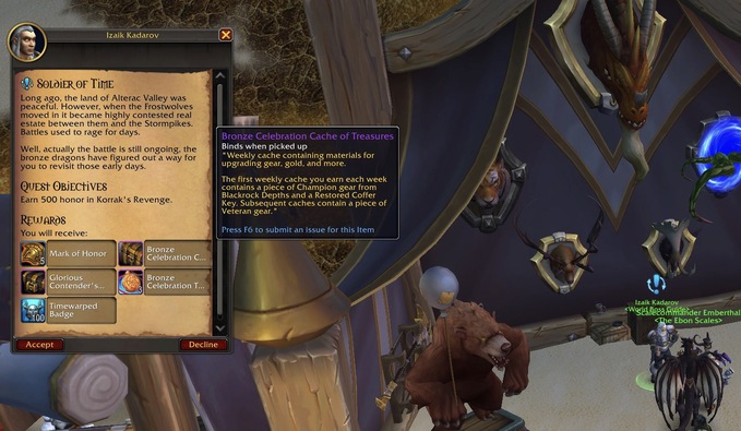 Visit the Caverns of Time anniversary event area and accept all weekly quests there.
